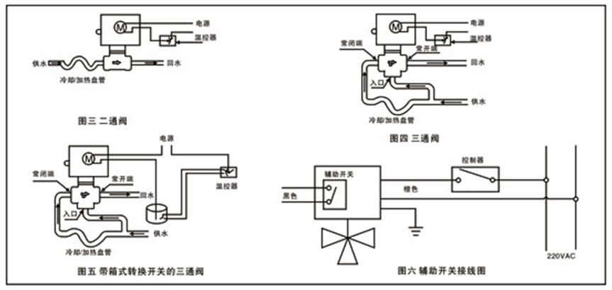 常閉二通閥和混合三通閥的安裝如圖形3、4所示。對于高層建筑物,應在底層支管上采用減壓閥。安裝閥體時,應注意閥體的箭頭指向,若帶有輔助開關,其接線如圖6所示。
